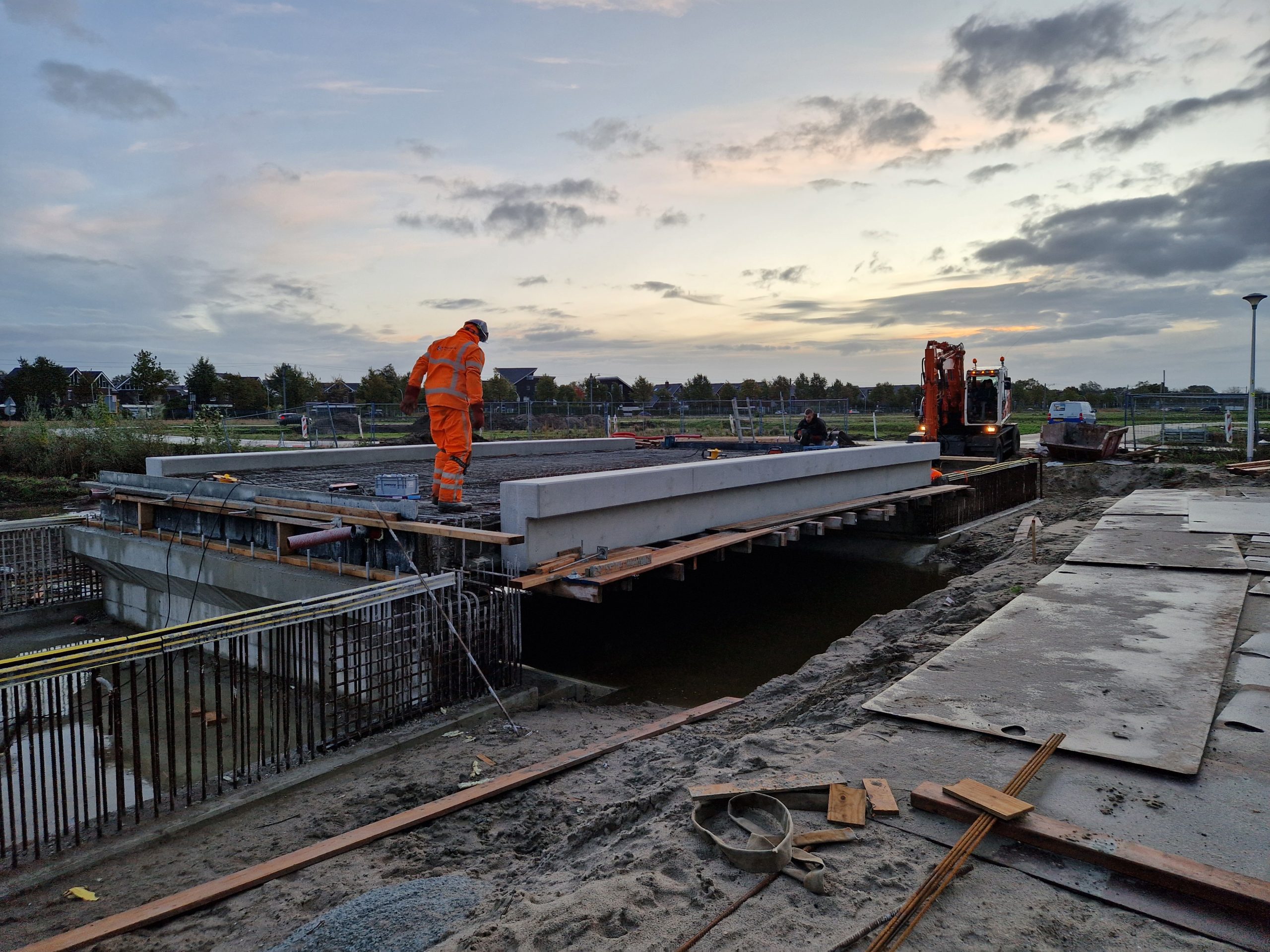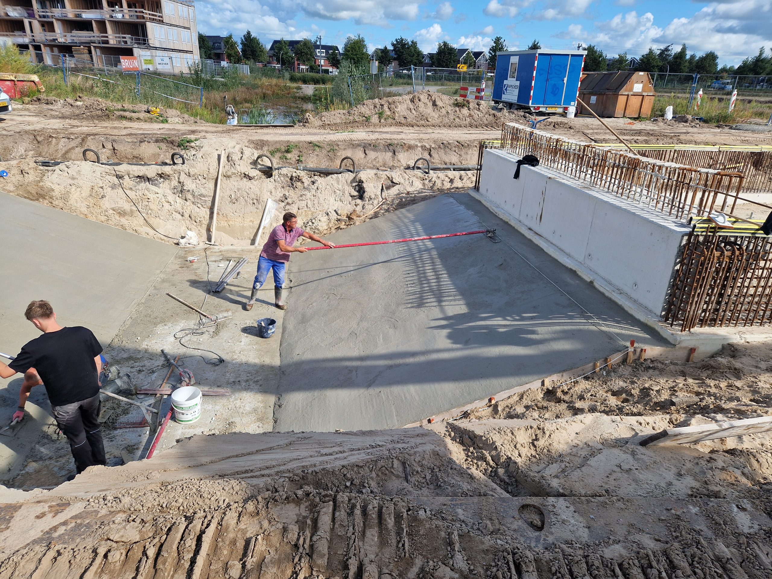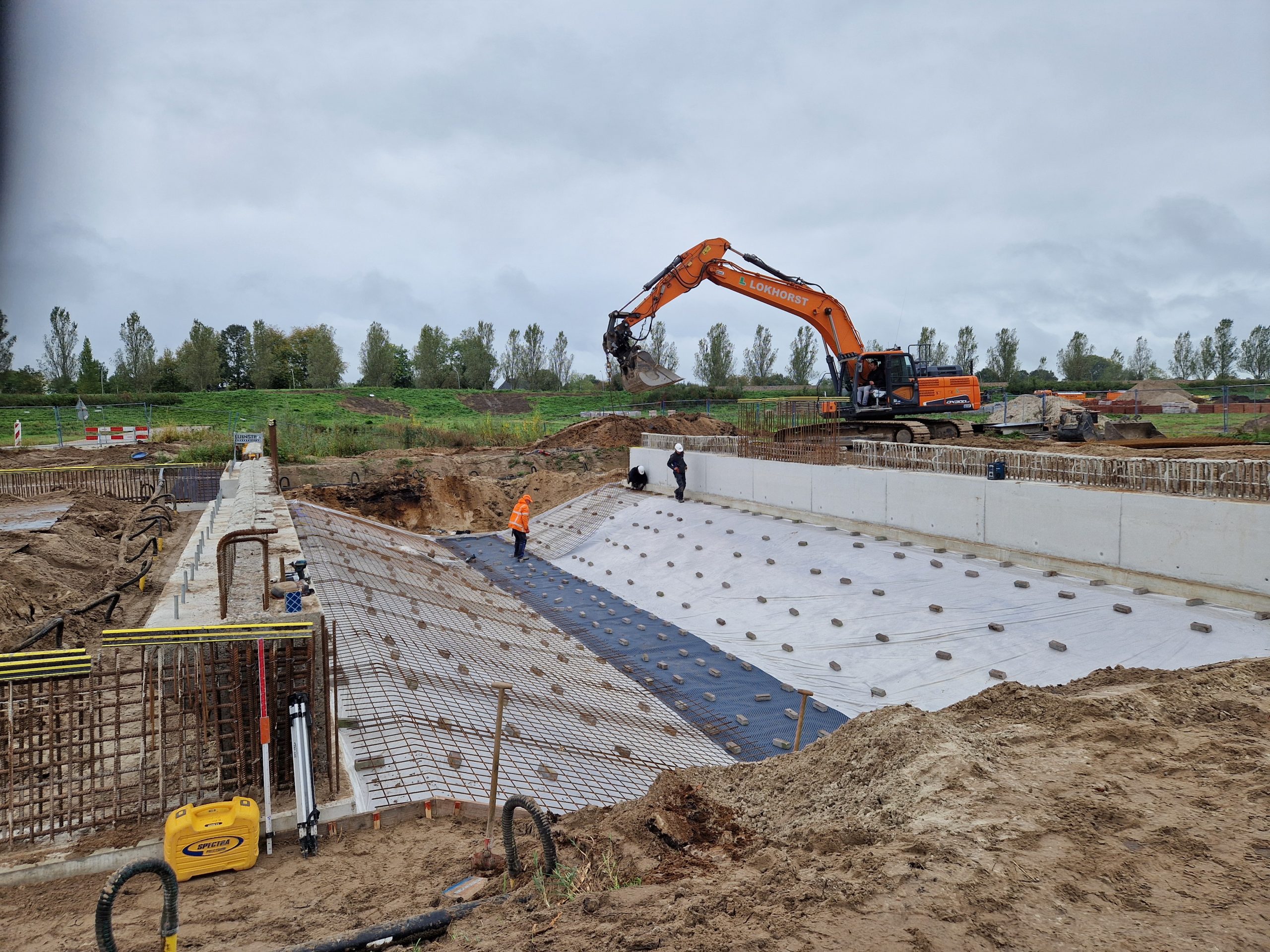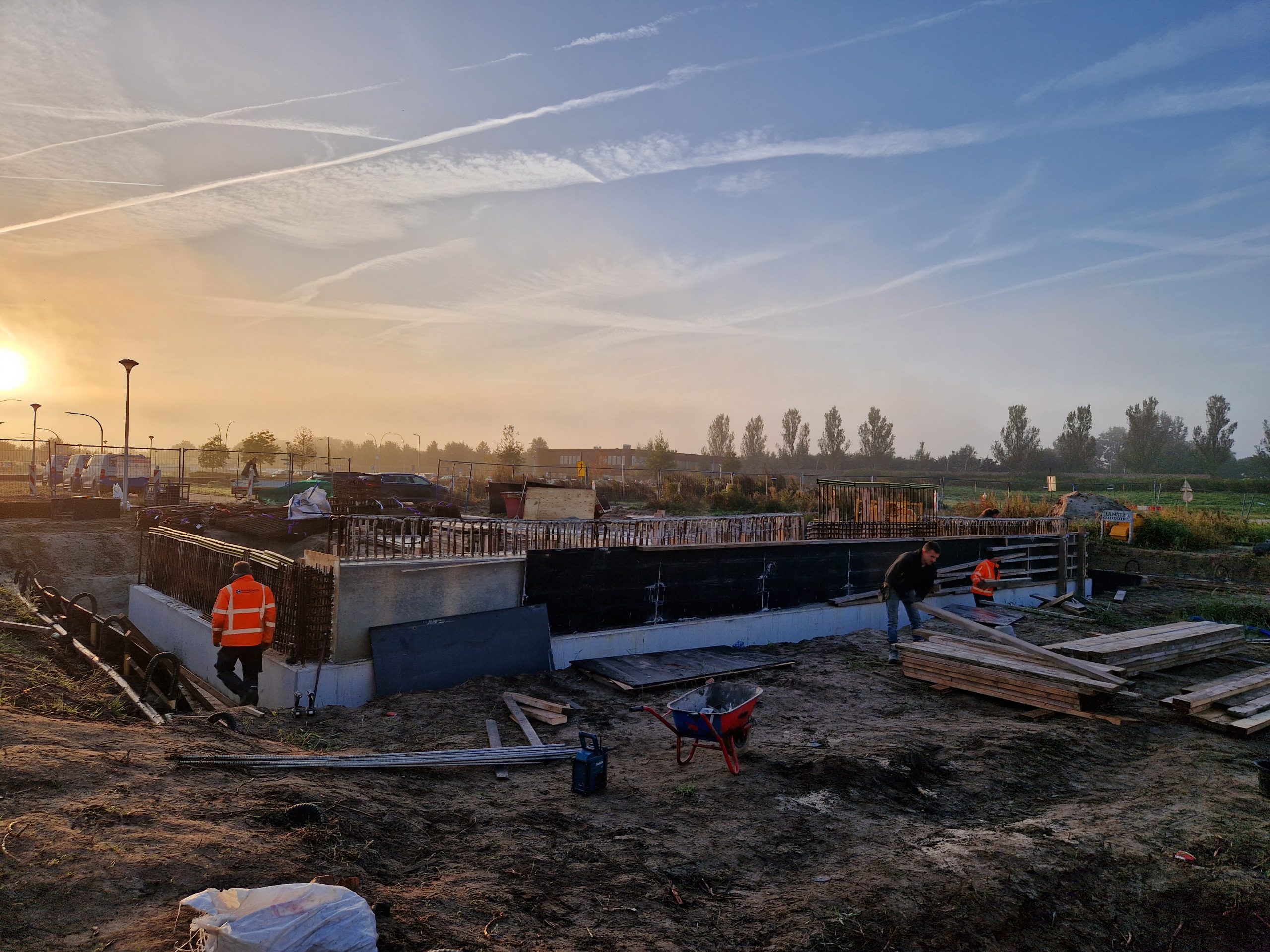 Na de zomervakantie (2025) zijn we gestart met de bouw van bruggen K17 en K18-19. Na het realiseren van grondwerk en bronbemaling voor de bouwkuipen, zijn de landhoofden in het werk gerealiseerd. Aansluitend zijn de prefab betonliggers voor de brugdekken aangebracht en de druklagen gestort. De grotere verkeersbruggen zijn voorzien van metselwerk met een facetrand van in het werk gestort beton. Prachtig! Alle bruggen zijn voorzien van een voor de woonwijk De Tippe uniek leuningwerk. Special: de taluds onder de bruggen zijn geheel bekleed met een gewapende betonverharding en zijn daarmee onderhoudsvrij.