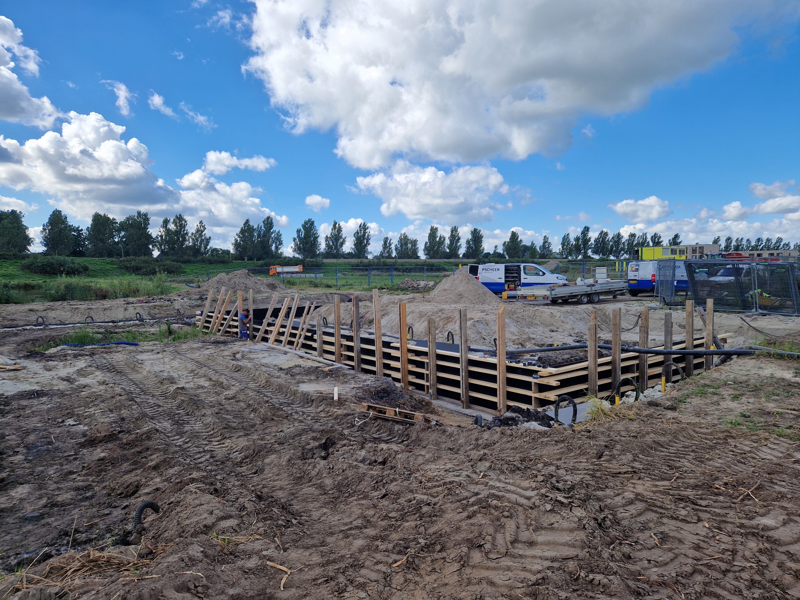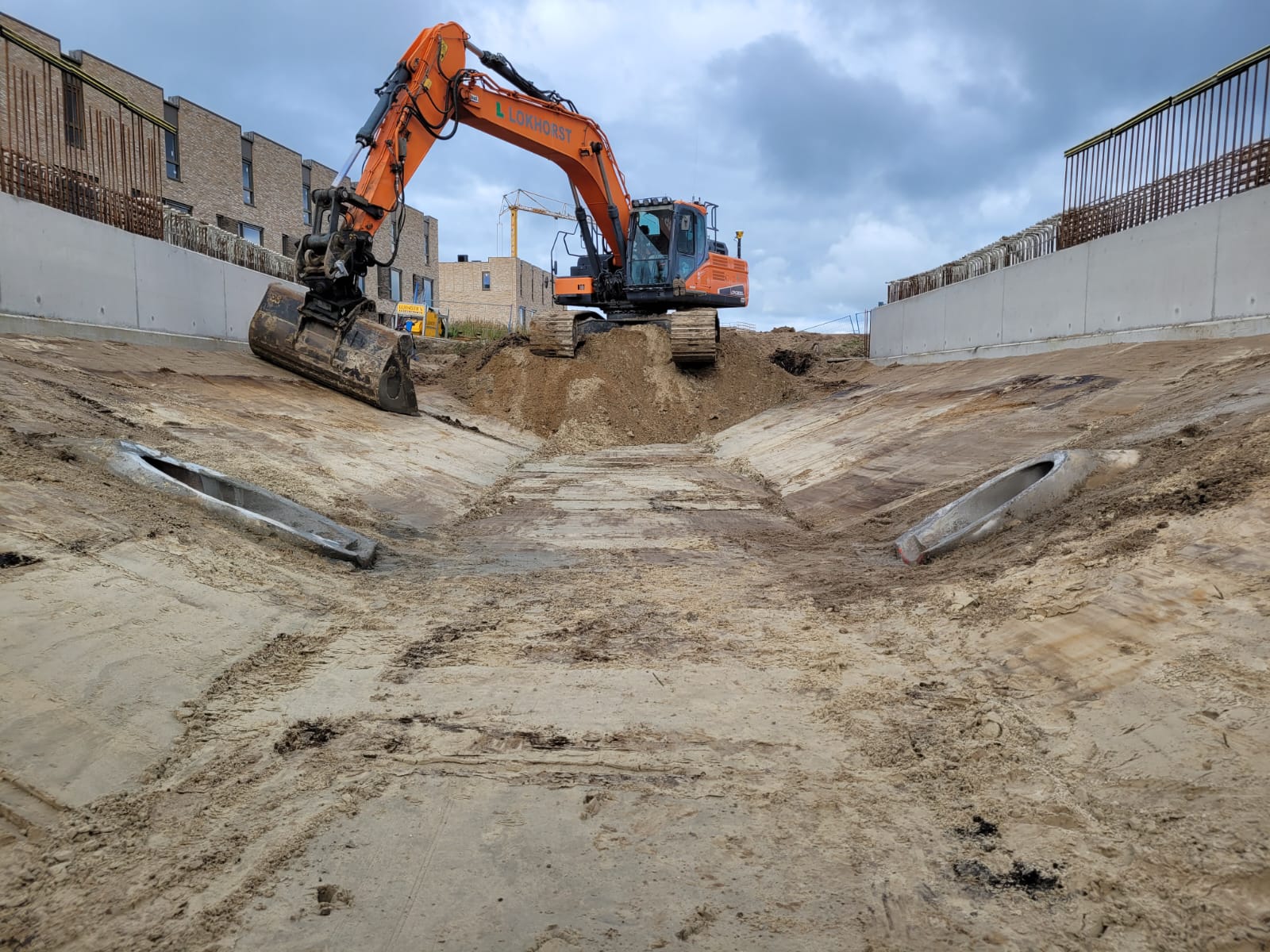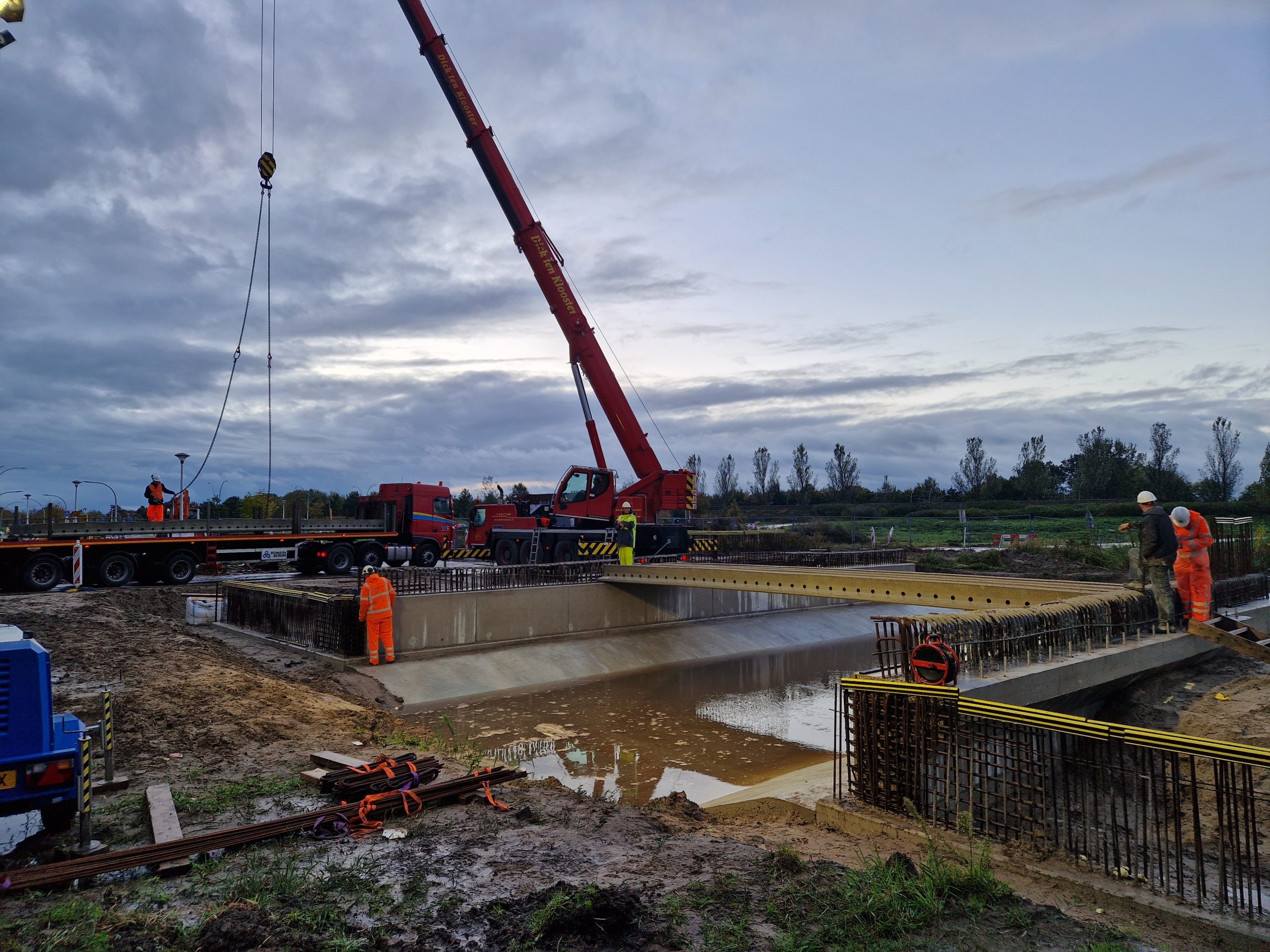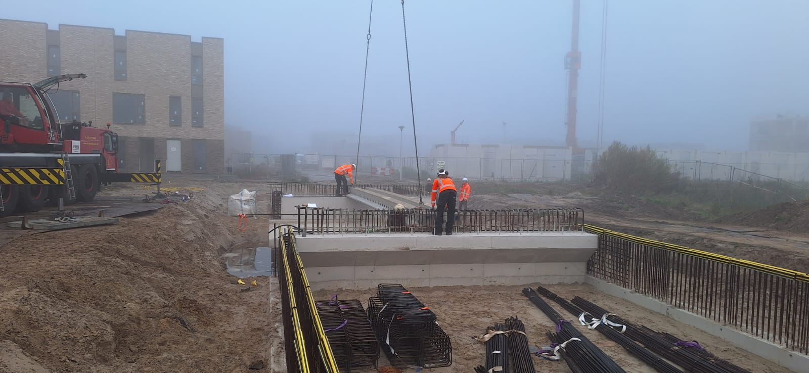Na de zomervakantie (2025) zijn we gestart met de bouw van bruggen K17 en K18-19. Na het realiseren van grondwerk en bronbemaling voor de bouwkuipen, zijn de landhoofden in het werk gerealiseerd. Aansluitend zijn de prefab betonliggers voor de brugdekken aangebracht en de druklagen gestort. De grotere verkeersbruggen zijn voorzien van metselwerk met een facetrand van in het werk gestort beton. Prachtig! Alle bruggen zijn voorzien van een voor de woonwijk De Tippe uniek leuningwerk. Special: de taluds onder de bruggen zijn geheel bekleed met een gewapende betonverharding en zijn daarmee onderhoudsvrij.