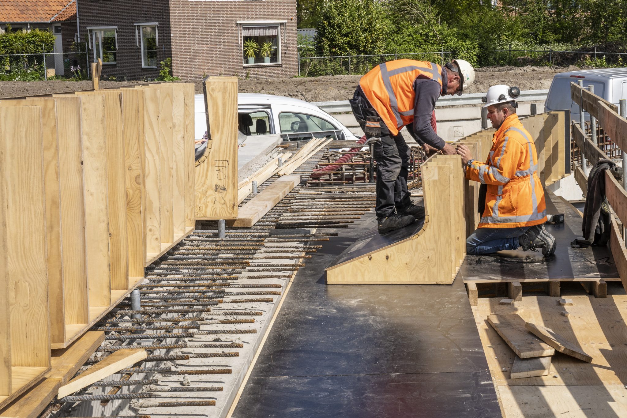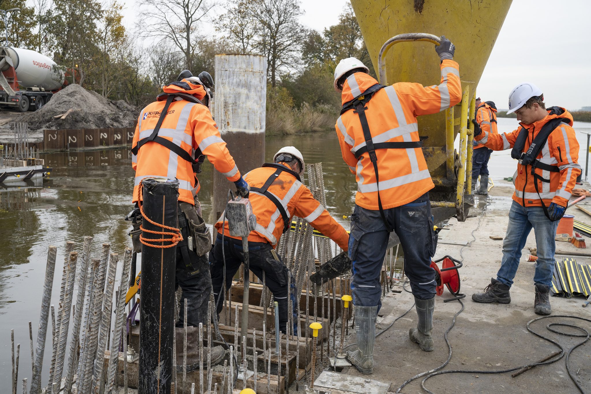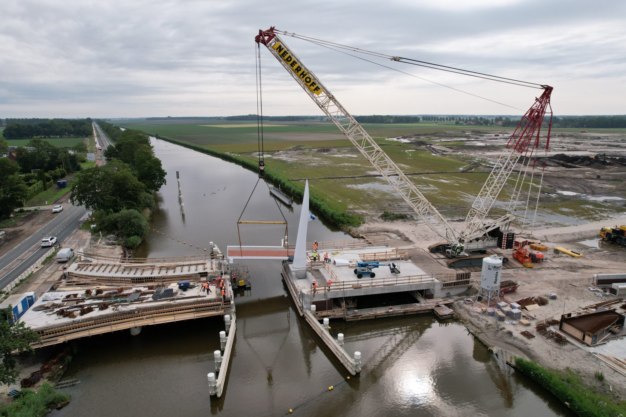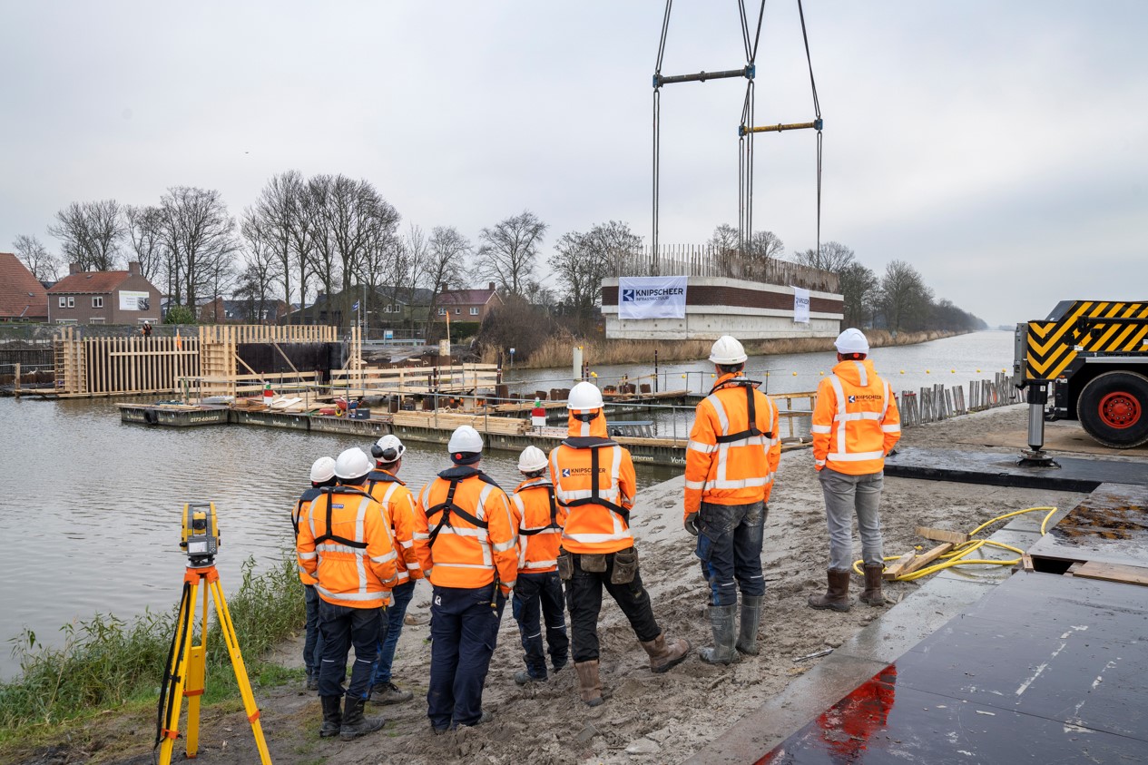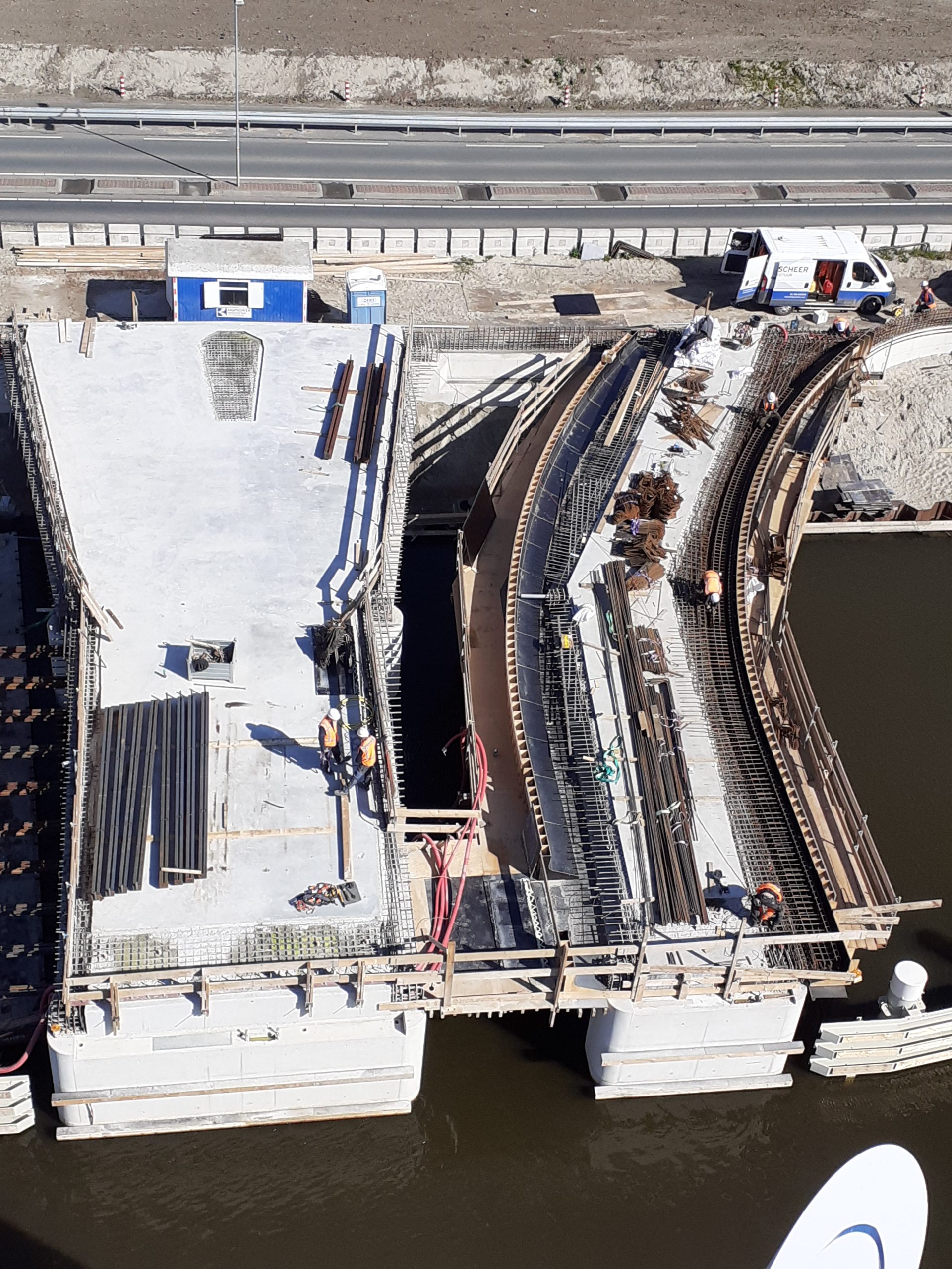 Om de hinder tot een minimum te beperken en kosten te besparen, hebben we op de oever een prefab fabriek ingericht. De brugkelder die in de as van de brug ligt is op de oever in Urk geprefabriceerd. Deze is in één hijsbeweging op de funderingsconstructie van prefab betonpalen en stalen buispalen geplaatst. Bovenop de bakken is vervolgens de gehele betonconstructie ter plekke gemaakt. We hebben in het water gebouwd zonder bouwkuip. Een aanzienlijke kostenbesparing.