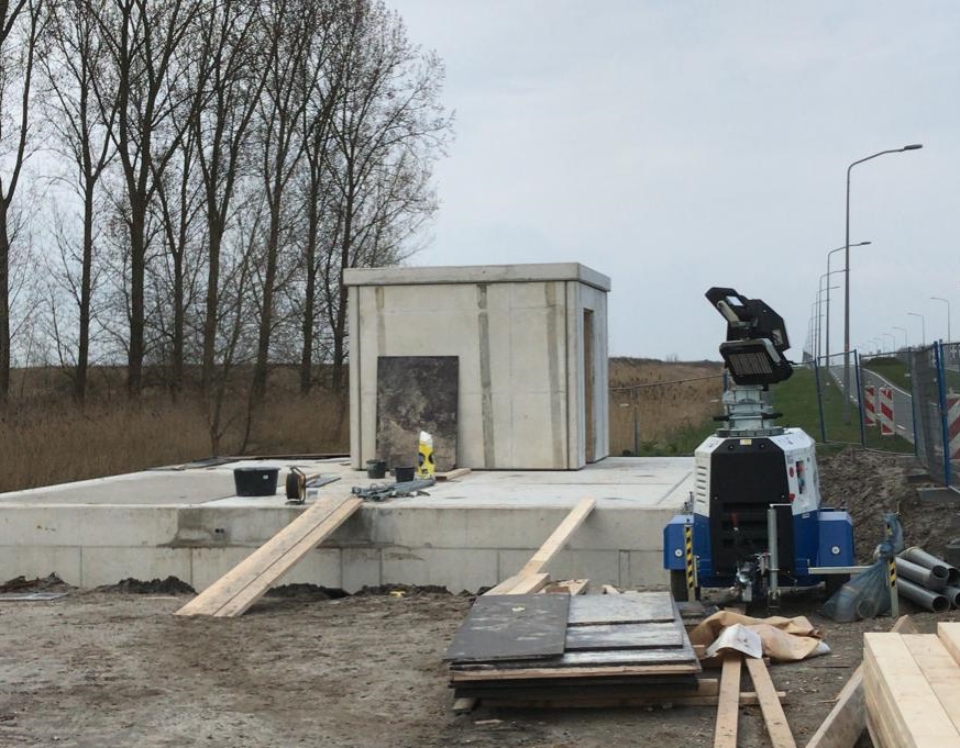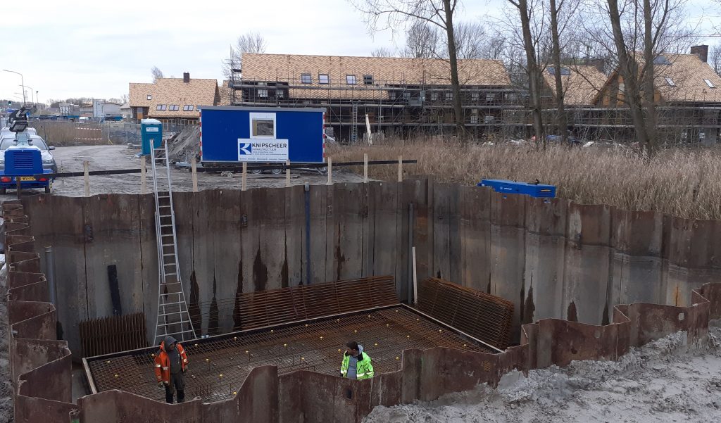 Naast deze specifieke manier van afvoer diende ook een rioolpompgemaal ontworpen en gerealiseerd te worden in onderdeel van de beschermings­zone bestaand dijklichaam. Om de bouwput stabiel te krijgen waren extra constructieve maatregelen nodig. Uiteindelijk is de pompkelder binnen de bouwkuip constructie middels een fundering van onderwaterbeton ge­realiseerd en is met prefab elementen ook de maaiveldinrichting van de pompkelder gebouwd. Dit alles in eigen beheer uitgevoerd.